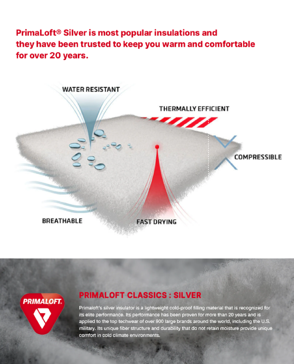 Primaloft®是頂級的高效能人造羽絨。它具備極高的溫重比,在維持輕盈手感的同時,擁有優異的抗水性,在低溫潮濕環境下,依然能鎖住體溫並維持乾爽。